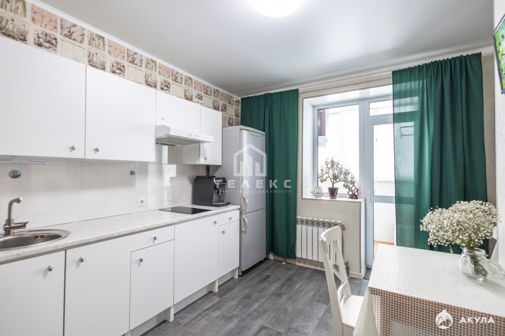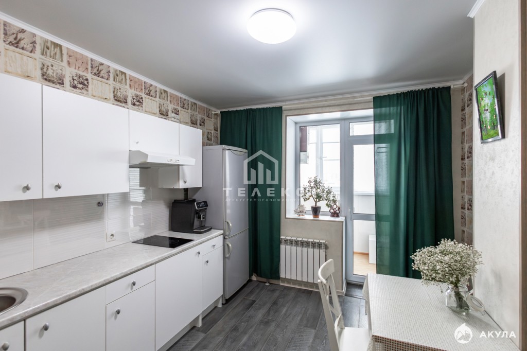 Просторная кухня с гарнитуром и встроенной техникой, из нее имеется выход на застекленный балкон. Сан.узел совмещен, облицован кафелем, установлена душевая кабина - за счет этого пространство смотрится более просторно. Мебель в квартире остается по договоренности. Для вашего удобства установлены приборы учета холодной и горячей воды, а также счетчик на свет, который находится прямо в квартире.
