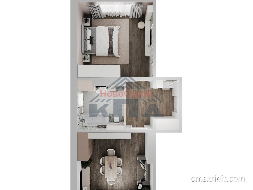 Еще одна квартира нового современного формата с кухней-гостиной и такой же по площади жилой комнатой, которые расположены напротив друг друга. Ее общая площадь 55 кв. м. (с учетом 50% площади лоджии). Эта квартира подойдет для семейных пар и для одиноких пока людей.