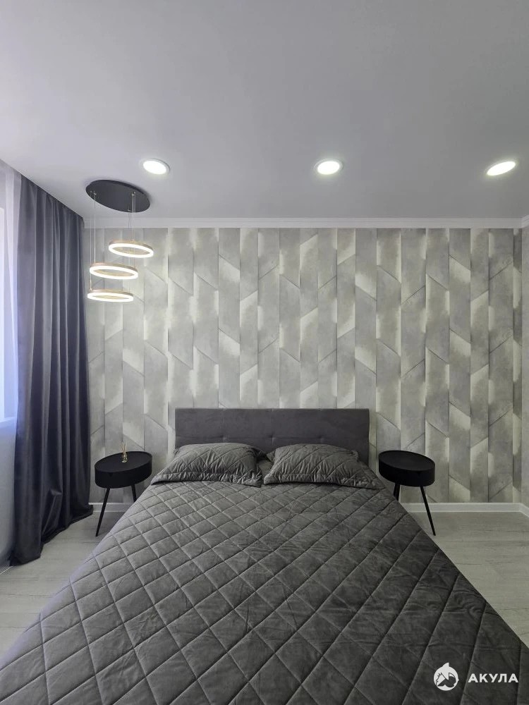 - Ровные стены, обои стилизованные под штукатурку, потолок натяжной, на полу уложен ламинат