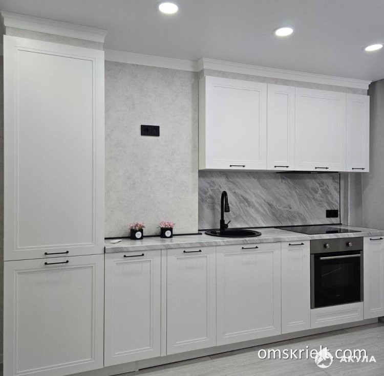 - Кухонный гарнитур со встроенной техникой (духовой шкаф, варочная поверхность, вытяжка), обеденный стол и стулья