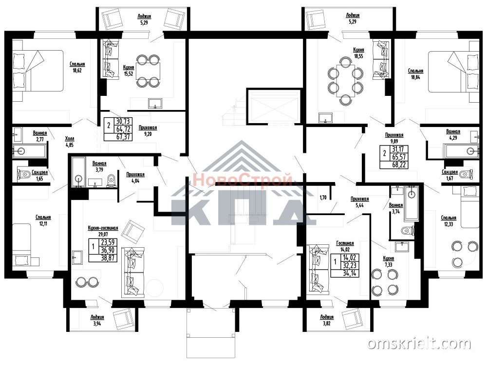 2-комнатиная квартира общей площадью 67, 37 кв. м. (с учетом 50% площади лоджии) с просторной кухней 16 кв. м., из нее можно сразу выйти на лоджию более 5 кв. м. Об этом мечтают многие хозяйки. Так удобно морозить пельмени, сделанные всей семьей за круглым столом или повесить белье, не бегая через всю квартиру. Да и просто отдохнуть после дел праведных с чашкой чая, наслаждаясь пейзажем будет очень приятно всем членам семьи. Такая площадь кухни позволит вам использовать ее как кухню -гостиную, а две комнаты: 18, 62 и 12, 11кв. м., расположенных друг напротив друга – использовать под спальню и детскую или под две спальни. В них прекрасно могут поместиться, помимо кроватей: шкафы, столы, тумбы и стеллажи. Между комнатами расположен раздельный санузел. А в большой прихожей (более 9 кв. м.) можно установить не только шкаф-купе, но и спортивный уголок.