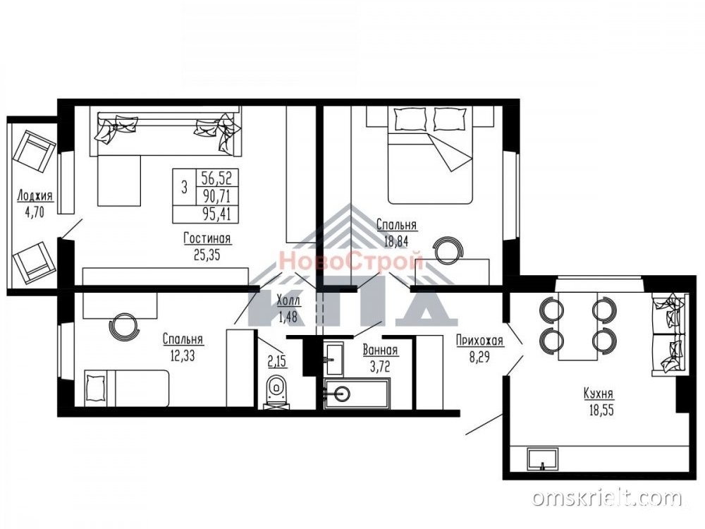 3-комнатная квартира площадью 93 кв.м. очень подойдет для большой дружной семьи. Три просторные комнаты, площадь которых 25, 19 и 12 кв.м., позволят разместить и 2-3 детей, и родителей, и даже бабушку и дедушку. Из самой большой комнаты можно выйти на просторную лоджию около 5 кв. м. Кухня удобная, квадратная в плане и площадью почти 19 кв.м. может выполнять функцию гостиной, где собираются все члены семьи за общим столом, где встречают родственников и друзей. Окна кухни и одной из жилых комнат выходят на юго-восток, во двор, окна двух других - выходят на северо-запад. В прихожей расположен раздельный санузел, в котором устанавливается все необходимое сантехническое оборудование.