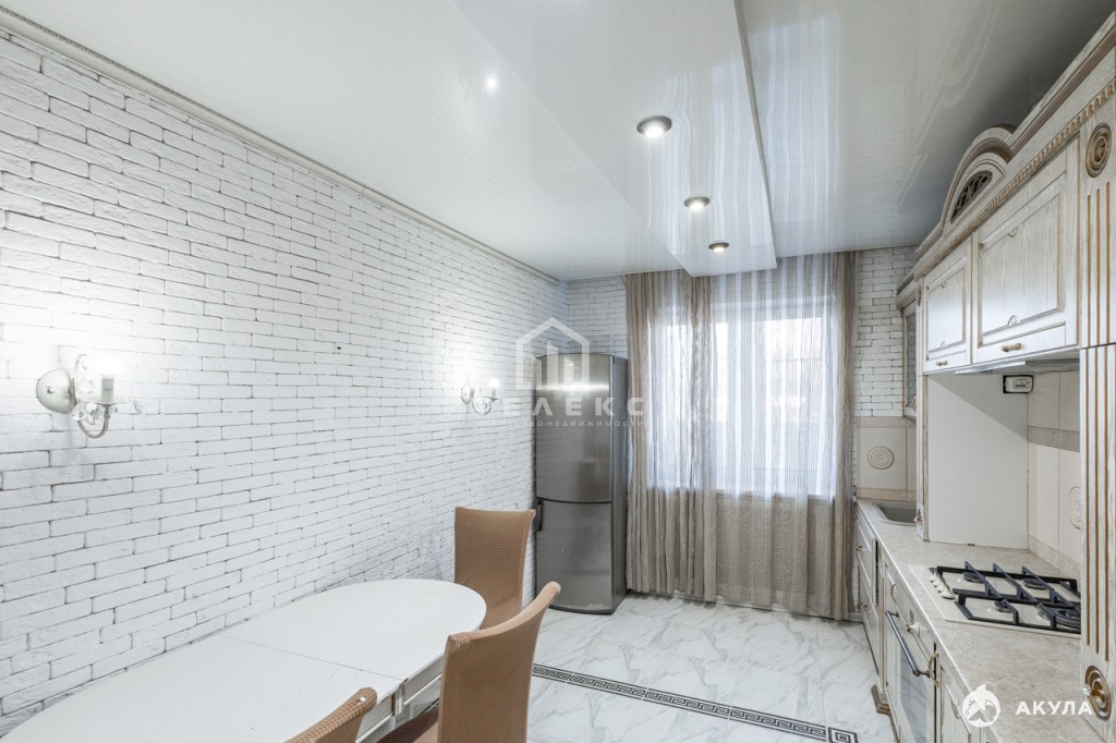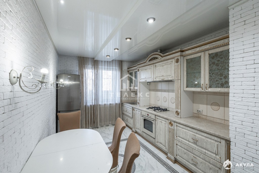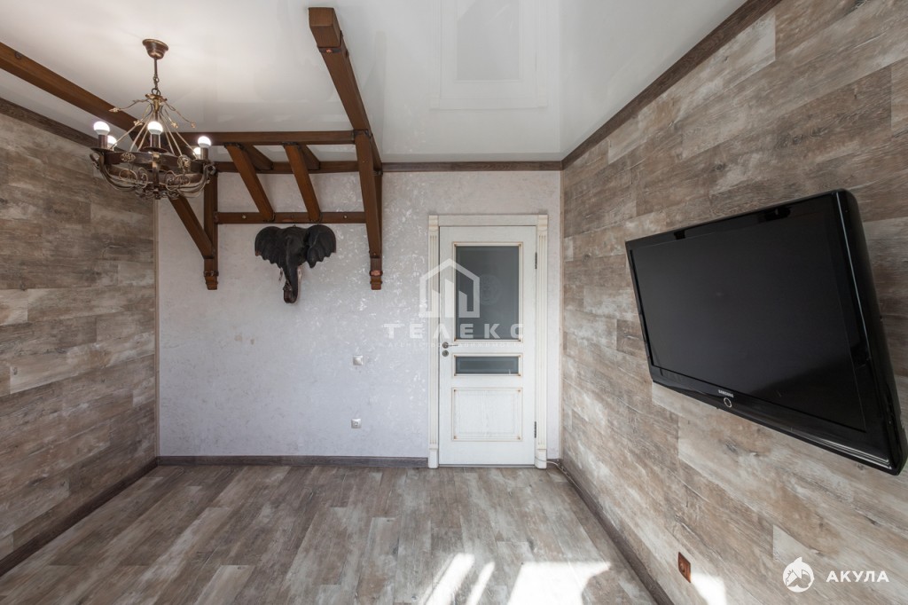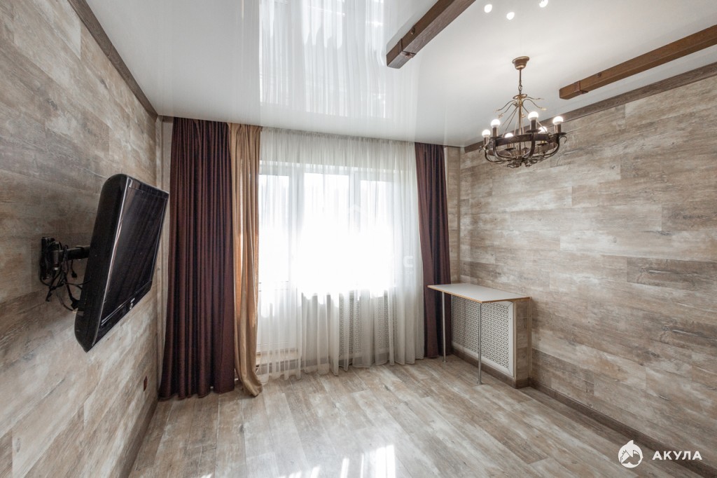 На полу: плитка, ламинат; на стенах: декоративная штукатурка, обои; в прихожей гипсовый кирпич. Во всей квартире натяжные потолки. Окна ПВХ.