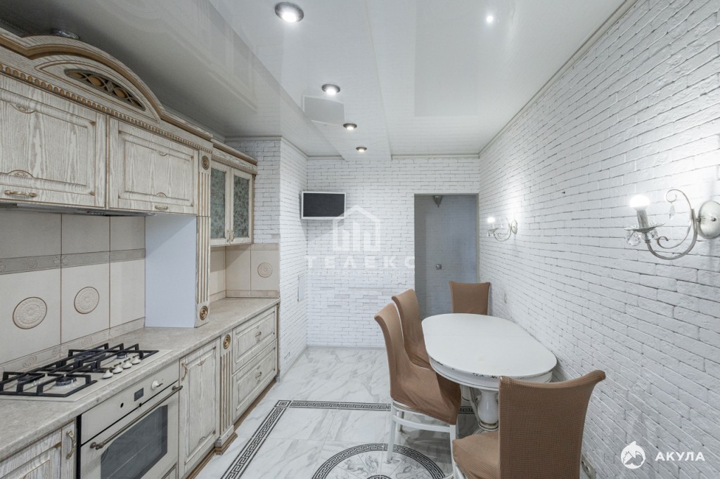 Кухня достаточно просторная (14 кв.м). Кухонный гарнитур со встроенной техникой, и обеденной зоной.