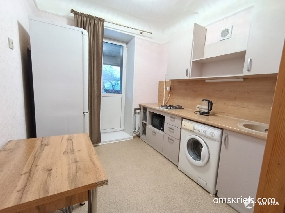 На кухне холодильник, стиральная машина, чайник электрический, посуда